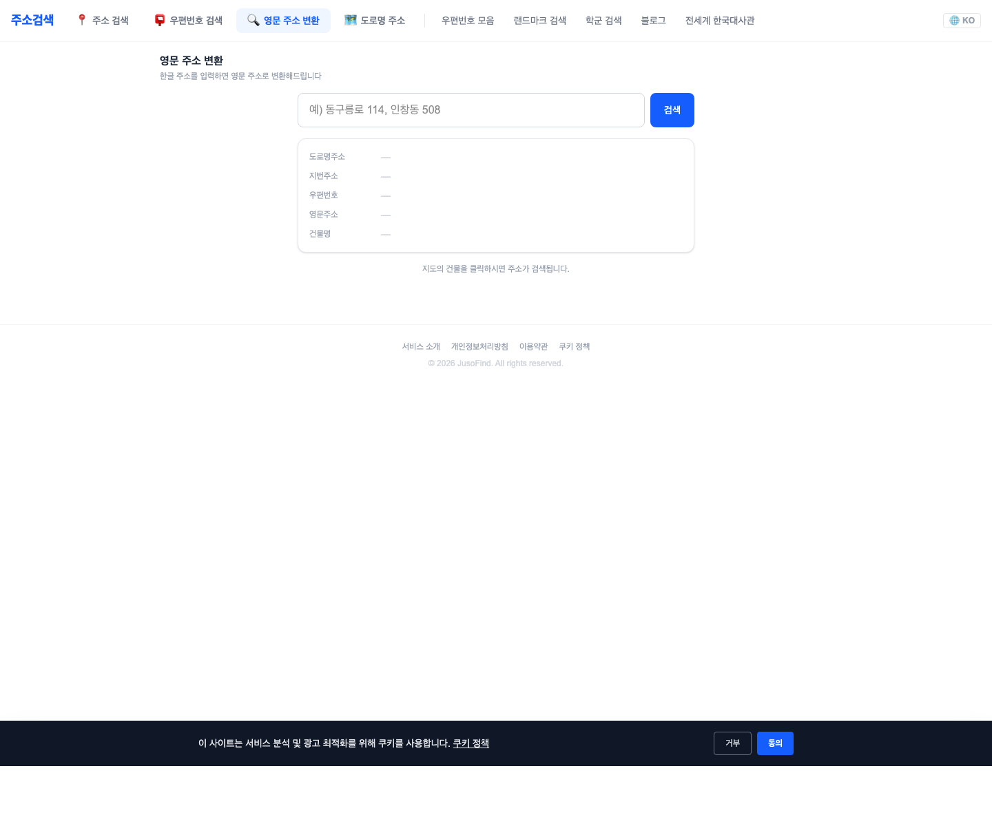 한국 주소 검색 엔진. 사이트맵·hreflang·Schema.org·OG 이미지 등 풀 SEO 스택 적용 — SEO HIGH 달성. 영어, 일본어 글로벌 페이지 제공.