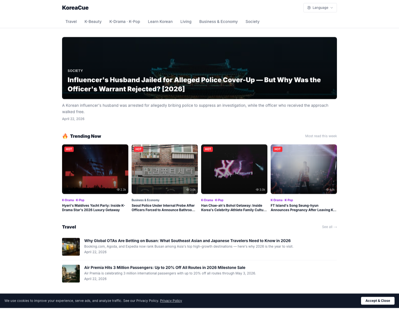 K-컬쳐/여행/뷰티/생활/사회 등 한국 소식을 전하는 글로벌 사이트. 영어, 일본어 등 약 100개국어 글로벌 페이지 운영. 풀 스택 SEO 최적화 웹 사이트.