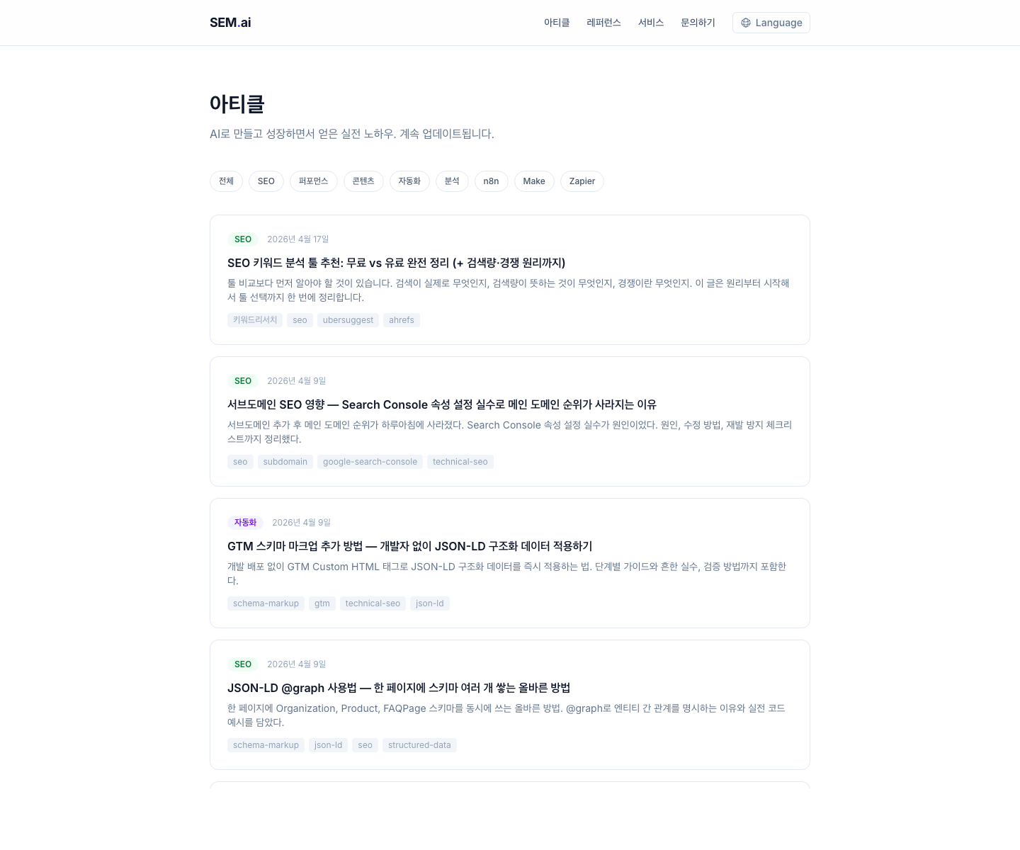 AI 그로스 마케팅 실무 아티클 허브. Claude 파이프라인으로 KO/EN 아티클 자동 생성 + Vercel 배포. (이 사이트)